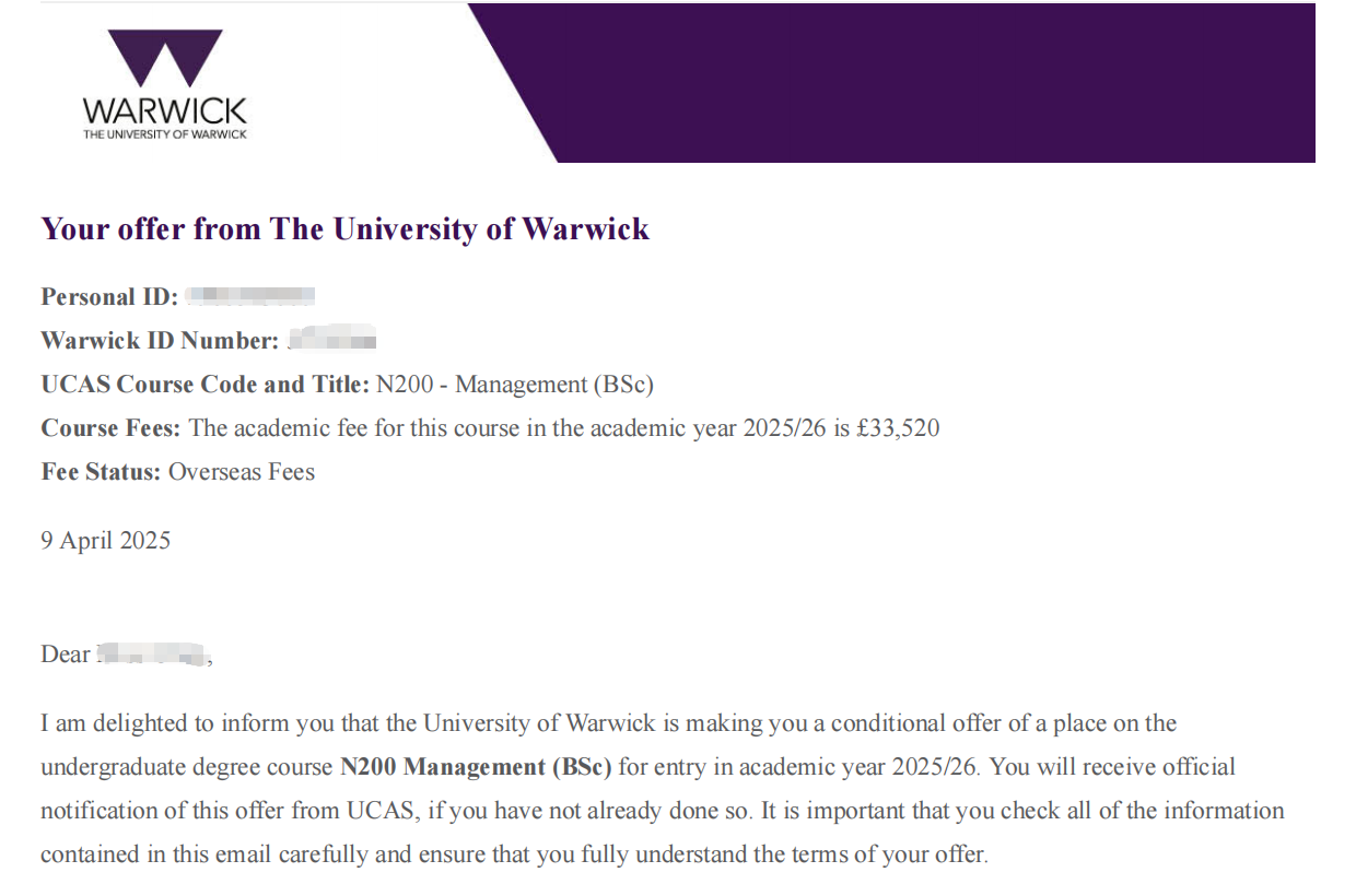 Congratulations! Offer from Warwick (UK) at World Ranking 69 (QS 2025)!