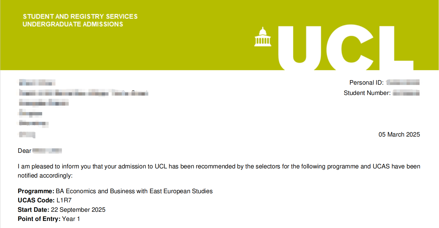 Congratulations! Offer from UCL (UK) at World Ranking 9 (QS 2025)!!!
