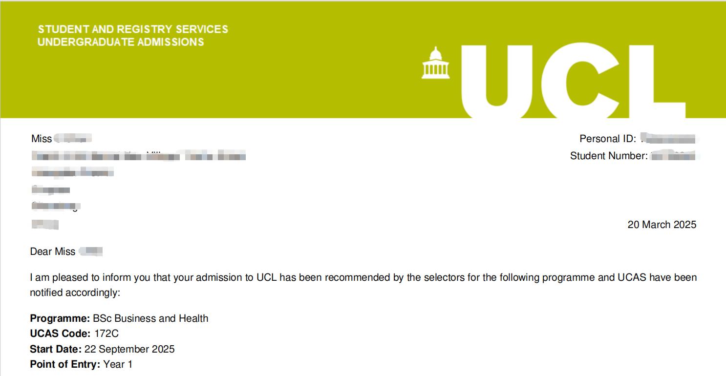 Congratulations! Offer from UCL (UK) at World Ranking 9 (QS 2025)!!!